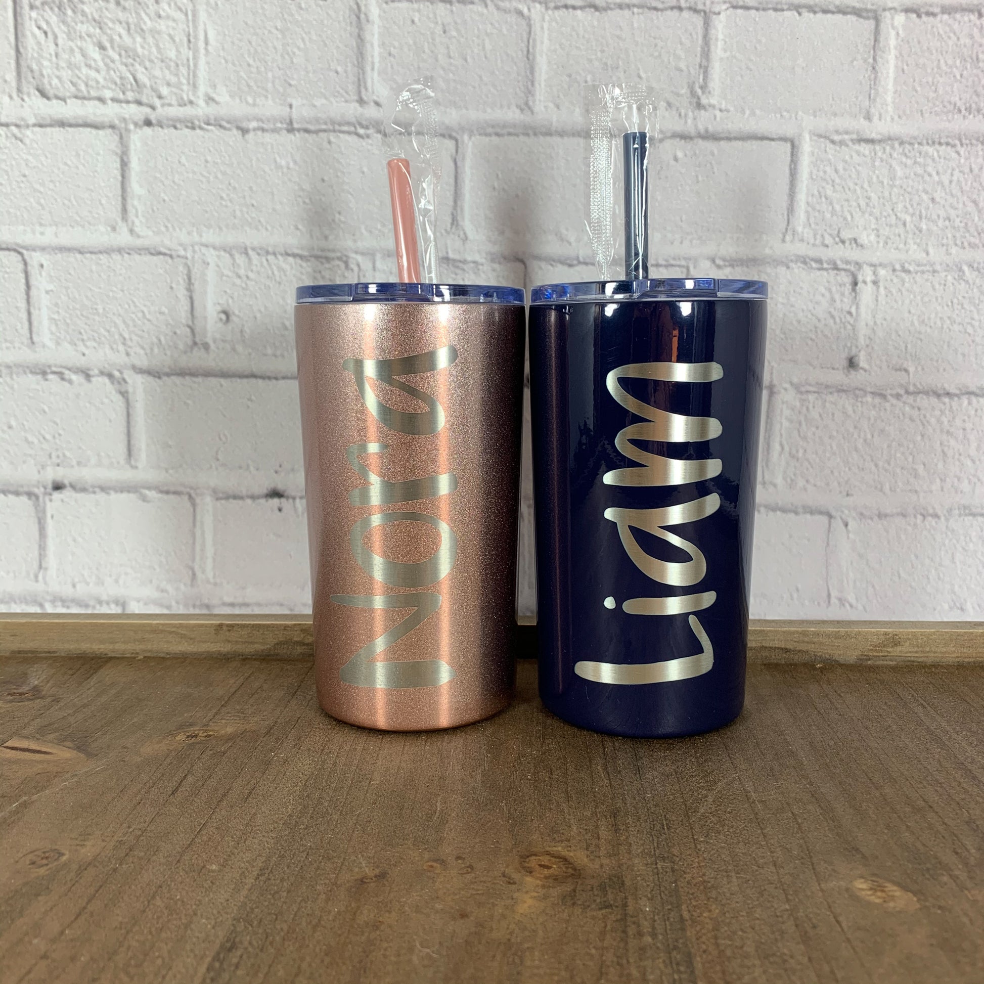 Discontinued style; whatever is in stock is all we can get! These Maars Skinny Mini kid’s tumblers come with a coordinating washable/reusable plastic straw. Cute size for flower girls and ring bearers. The stainless steel double insulated wall keeps drinks cold for up to 24 hours and drinks hot for up to 12 hours. Beautifully and perfectly laser engraved on your choice of color and font.