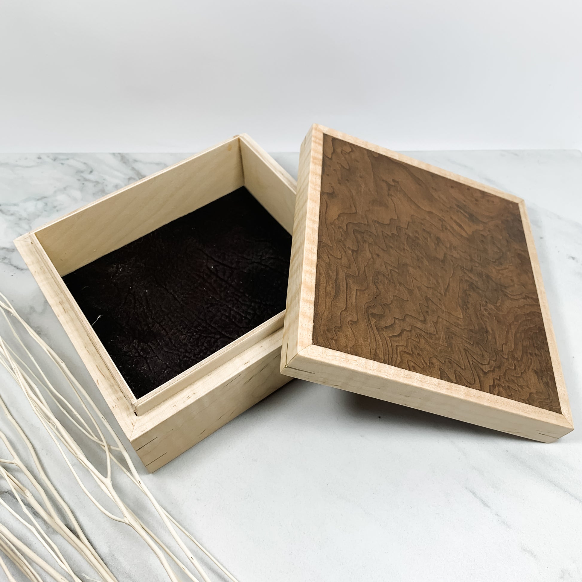 This beautiful, solid wood, handmade box is made from Redwood Burl and Curly Maple. The bottom is lined with genuine brown leather. There are 3 brass pins in each of the 4 corners. It is It is perfect for holding jewelry, small keepsakes and mementos.