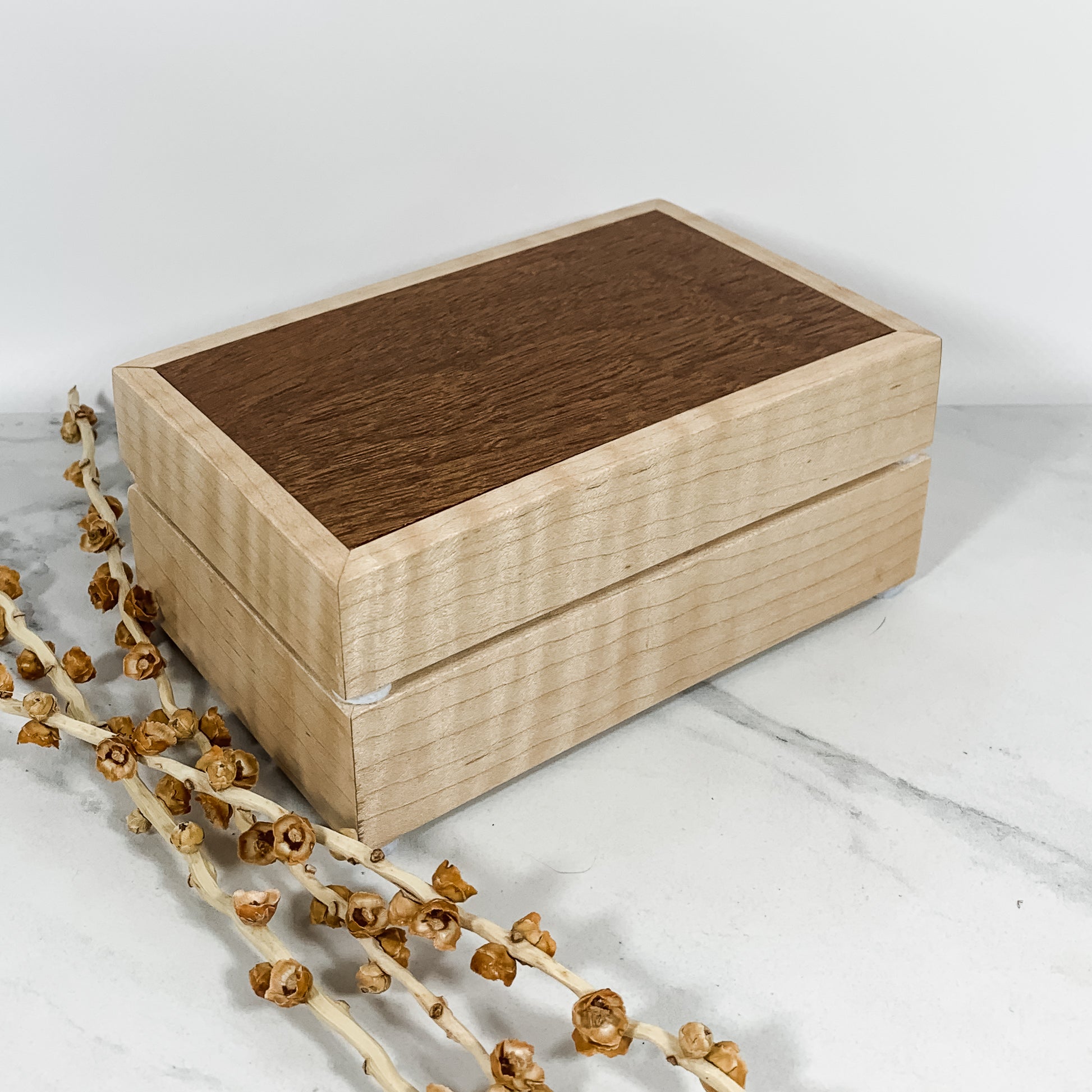 This beautiful, solid wood, handmade box is made from African Mahogany and Curly Maple. The lid is attached with 2 "hidden" brass hinges. It is perfect for holding jewelry, small keepsakes and mementos.
