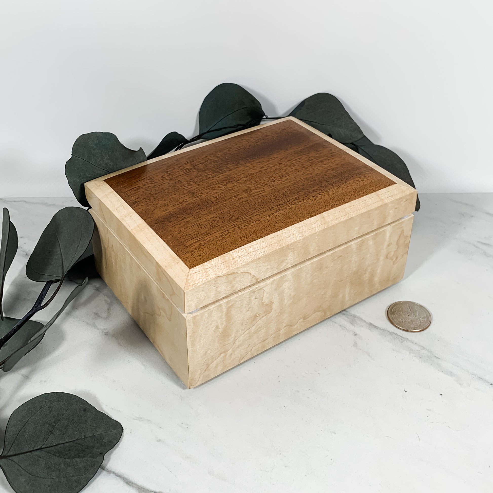This beautiful, solid wood, handmade box is made from Mahogany and shimmery Figured Maple. It is perfect for holding jewelry, small keepsakes and mementos.