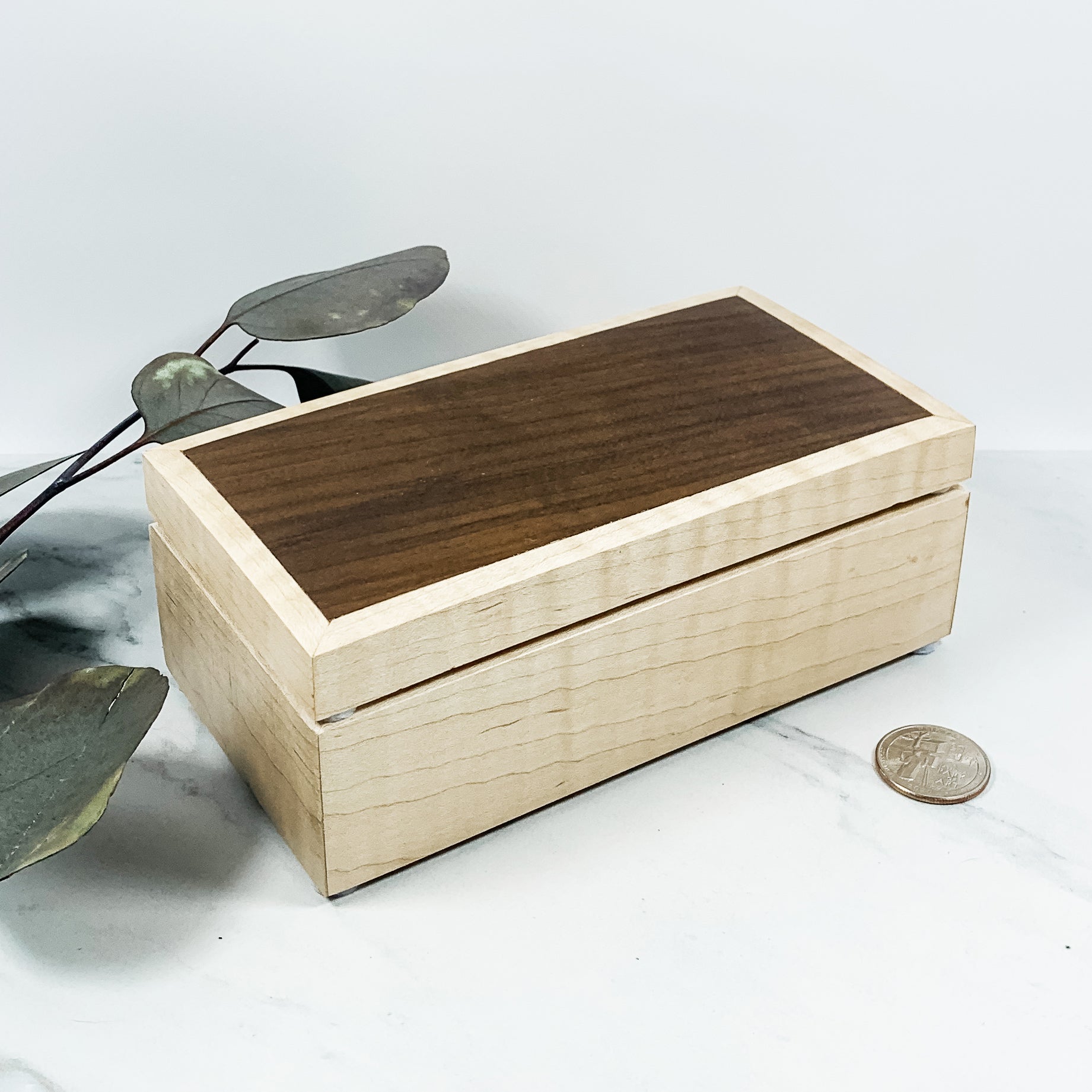 This beautiful, solid wood, handmade box is made from __ and shimmery Curly Maple. The lid is attached to the box with 2 brass hinges. It is perfect for holding jewelry, small keepsakes and mementos.