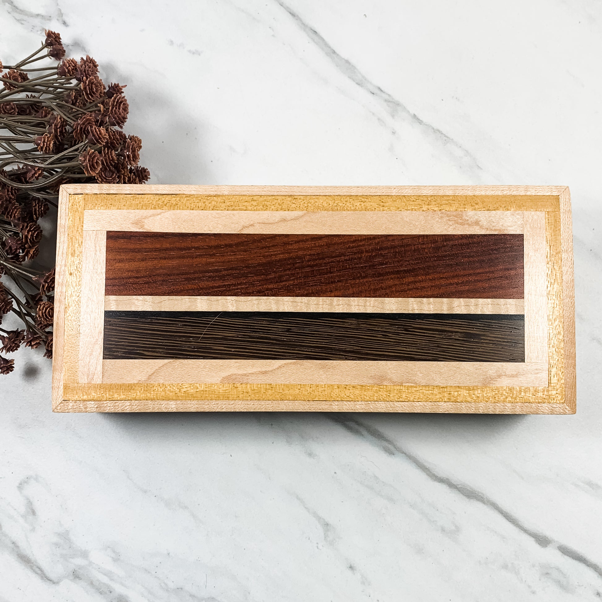 This beautiful, solid wood, handmade box is made from Pau Rosa, Wenge, Ebony, Yellow Heart, and shimmery Figured Maple. The bottom is lined with genuine black leather. It is perfect for holding jewelry, small keepsakes and mementos.